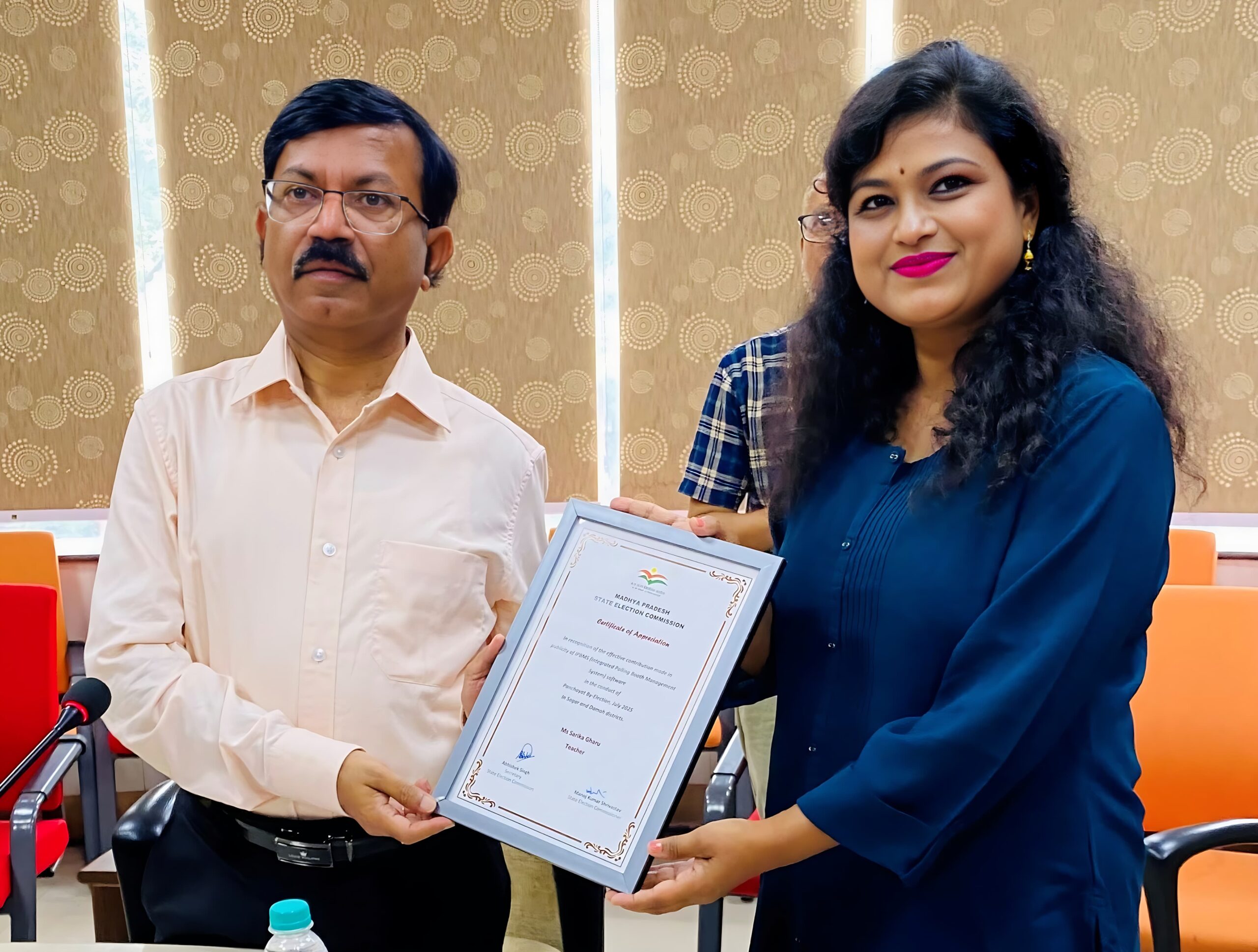 स्वतंत्रता दिवस के उपलक्ष्य पर प्रभावशाली जनजागरूकता के लिये राज्‍य निर्वाचन आयुक्‍त ने सारिका घारू को सम्‍मानित किया।स्‍टेट आईकॉन सारिका को पेपरलेस इलेक्‍शन जागरूकता के लिये दिया गया है ये सम्‍मान।इंटीग्रेटेड पोंलिंग बूथ मेनेजमेंट सिस्‍टम सॉफ्टवेयर के माध्‍यम से पंचायत उपनिर्वाचन मे प्रभावशाली जनजागरूकता के लिये राज्‍य निर्वाचन आयोग की स्‍टेट आईकॉन सारिका घारू को राज्‍य निर्वाचन आयुक्‍त मनोज कुमार श्रीवास्‍तव ने प्रशस्ति-पत्र देकर सम्‍मानित किया।निर्वाचन भवन मे आयोजित कार्यक्रम में सारिका को यह सम्‍मान प्रदान किया गया।इस अवसर पर आयोग के सचिव अभिषेक सिंह, अवर सचिव डॉ सुतेश शाक्‍य, अवर सचिव श्रीमती संजू कुमारी, प्रियंका त्रिपाठी,तथा अन्‍य अधिकारी उपस्थित थे।सारिका ने बताया कि मध्‍यप्रदेश राज्‍य निर्वाचन आयोग के पेपरलेस इलेक्‍शन के नवाचार को आम लोगों तक पहुंचाने प्रदेश में फ़्लैश मॉब,पपेटशो,लोकनृत्‍य,गीतो के माध्‍यम से गतिविधियां कीं।राज्‍य निर्वाचन आयुक्‍त मनोज श्रीवास्‍तव तथा आयोग के सचिव अभिषेक सिंह के निर्देशानुसार वे इस वर्ष के अंत में होने वाले पेपरलेस पंचायत उपचुनावों के लिये निरंतर जागरूकता गतिविधियां कर रही हैं।